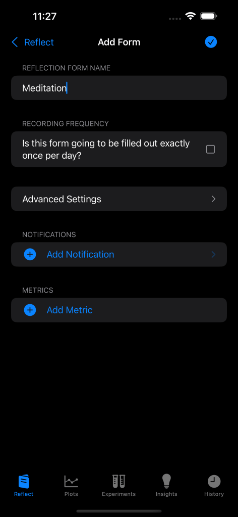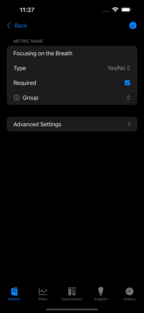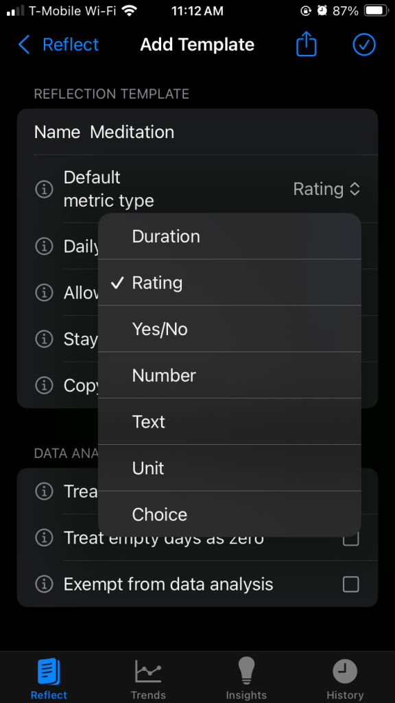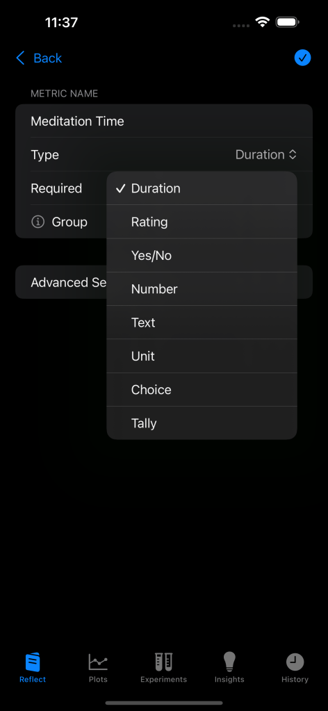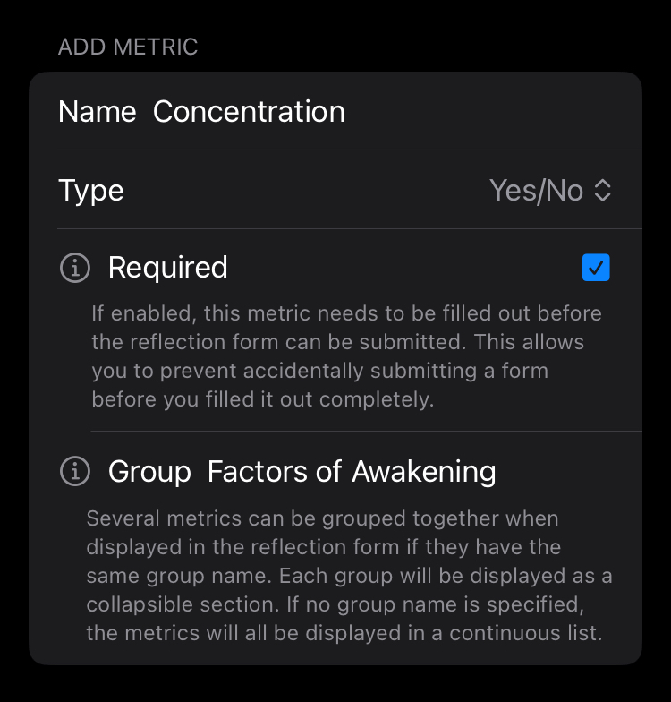When adding a metric to your reflection form, you must at least specify a name and a type. For example, if you wanted to track whether or not you were sitting cross-legged while meditating, you’d a Yes/No metric with the appropriate name. If you were tracking how long you were meditating for, you’d add a Duration metric for the amount of time you spent.