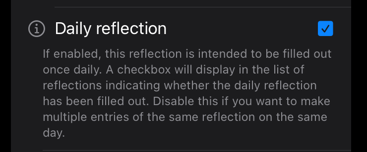 This setting affects data analysis because it tells the analysis to expect exactly one recording of this Reflection per day. If you miss this sort of Reflection on a particular day, there will be a yellow calendar indicator next to the Reflection name on the Reflect page the next day. There will also be a popup when you open the Reflection giving you the option to fill out your data for the missed day.