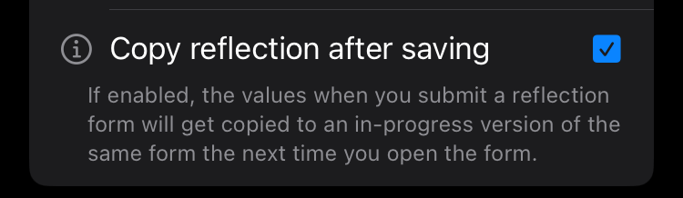 Sometimes you may want to record multiple instances of a Reflection back-to-back without having to navigate to the Reflection Form each time. Toggling this option on will allow the Reflection Form to remain on your screen once you save your metrics’ recordings.