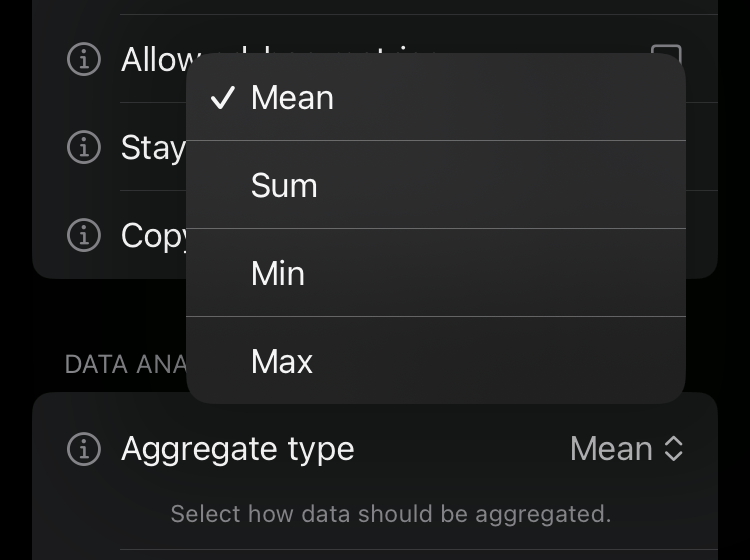 This setting determines how multiple recordings over the course of a day get evaluated in data analysis that spans multiple days. The options are taking the sum, the min, the max, or the average (mean) of all recordings. For example, you may want to analyze how the sum of your coffee consumption affects your average tiredness score for the last week. This setting is just the default for metrics in this Reflection. When you start to add metrics, this setting can be overridden.